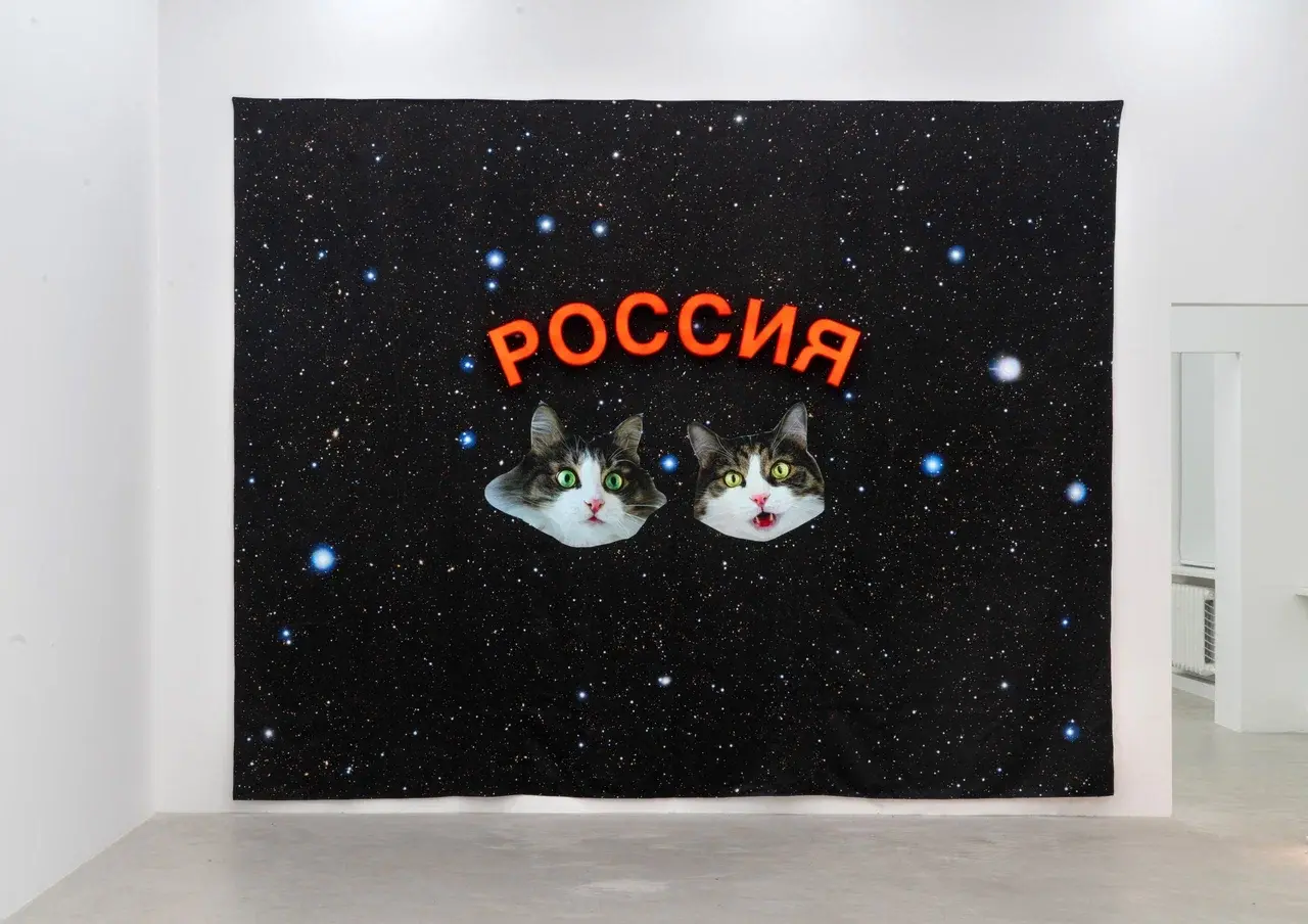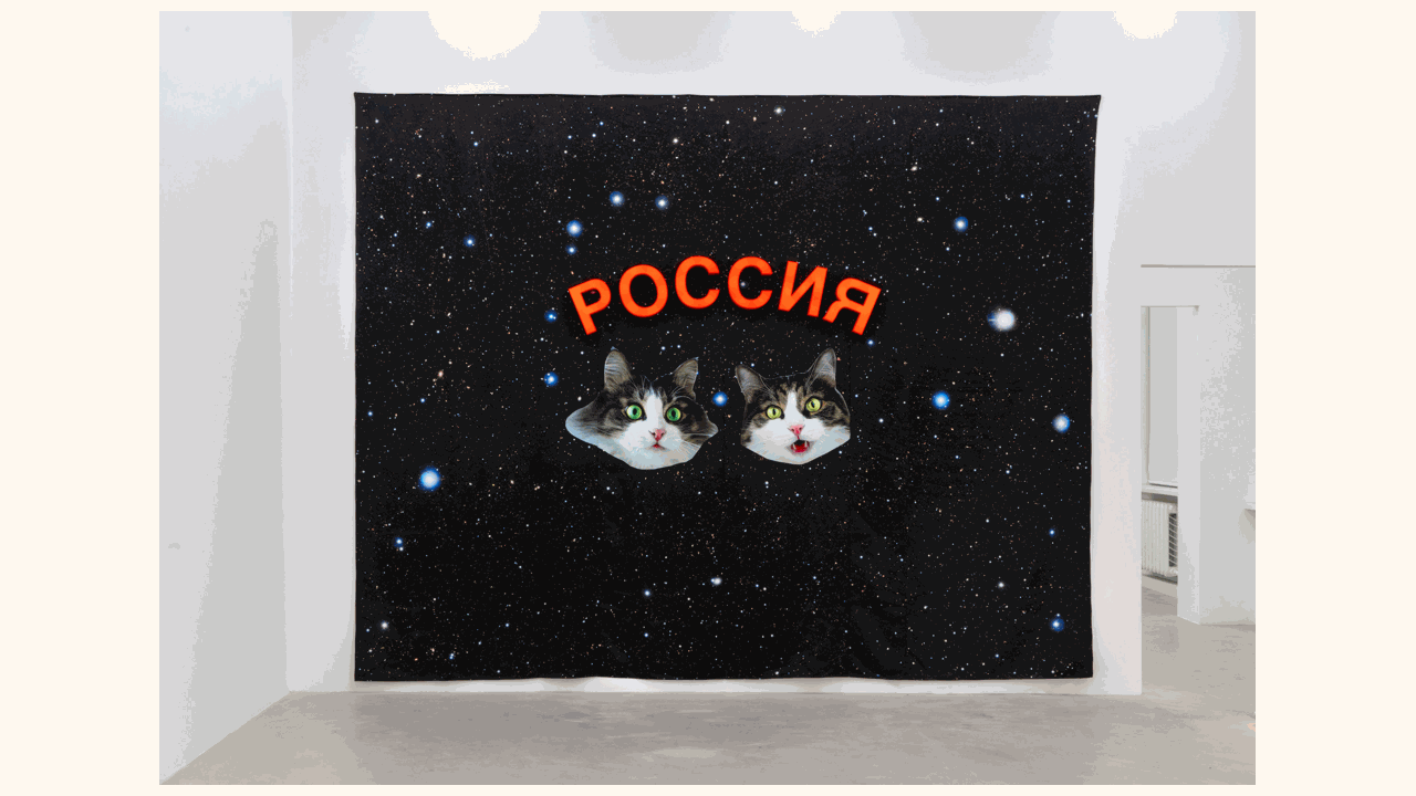 А в работе Глазун сошлось все: и отсылка к Пригову, и бесконечная любовь авторки к своим котам (сынкам) Улиссу и Федру, и даже «космический» оттенок самой «России» — все это делает работу программной для Алины.