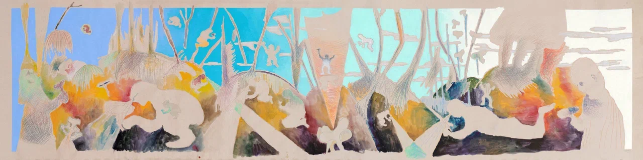 3. Петр Кирюша. Грибы из проекта «Турист», 2021. крафтовая бумага, акварель, акрил, цветные акварельные карандаши. 100 х 380 см
