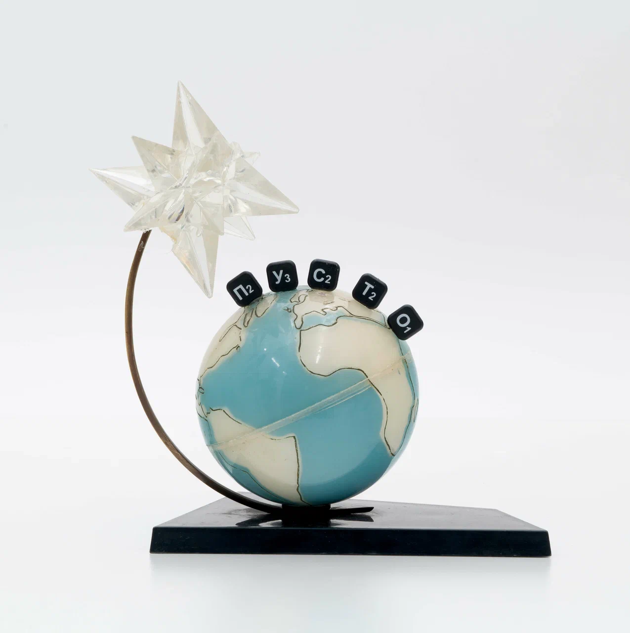В 2019 году Алина часто ездила в Измайлово на местный блошиный рынок. Как-то один мужик догнал ее со словами «девушка, вам точно нужны астероиды», и показал их ей на ладони — «астероидами» оказались с десяток каких‑то советских пластиковых объектов, утилитарное значение которых нам неизвестно. Согласившись с незнакомцем, Алина, конечно, «астероиды» купила и создала свою работу: союз крышки от шкатулки с глобусом, того самого астероида, летящего на Землю, и апокалиптического «пусто».