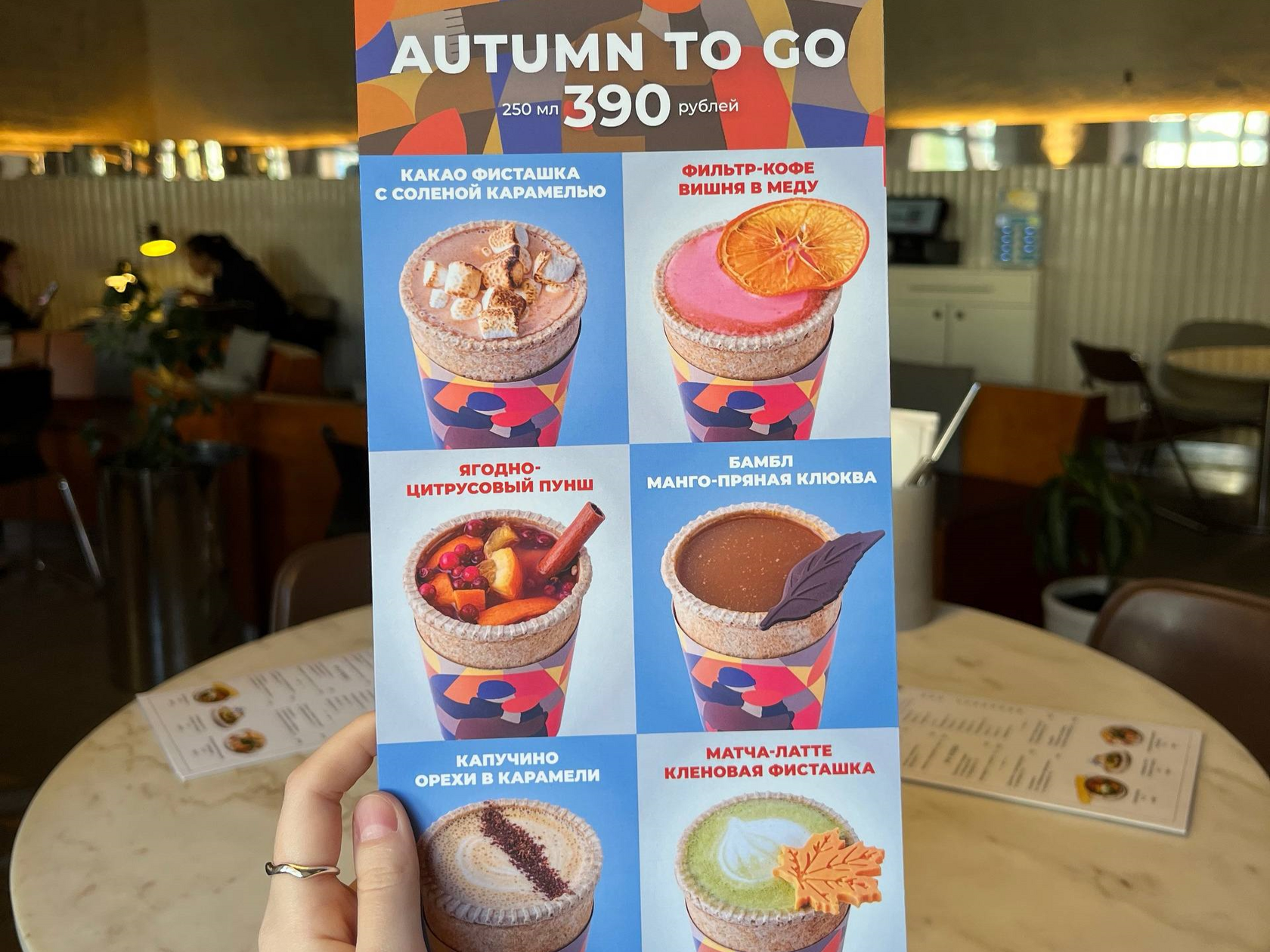 Дизайн стаканчиков для напитков придумала Анастасия Москвина, которая также создала большую мозаику внутри «Мечтателей». На стаканчиках — осень, теплые объятия и мечтатели.