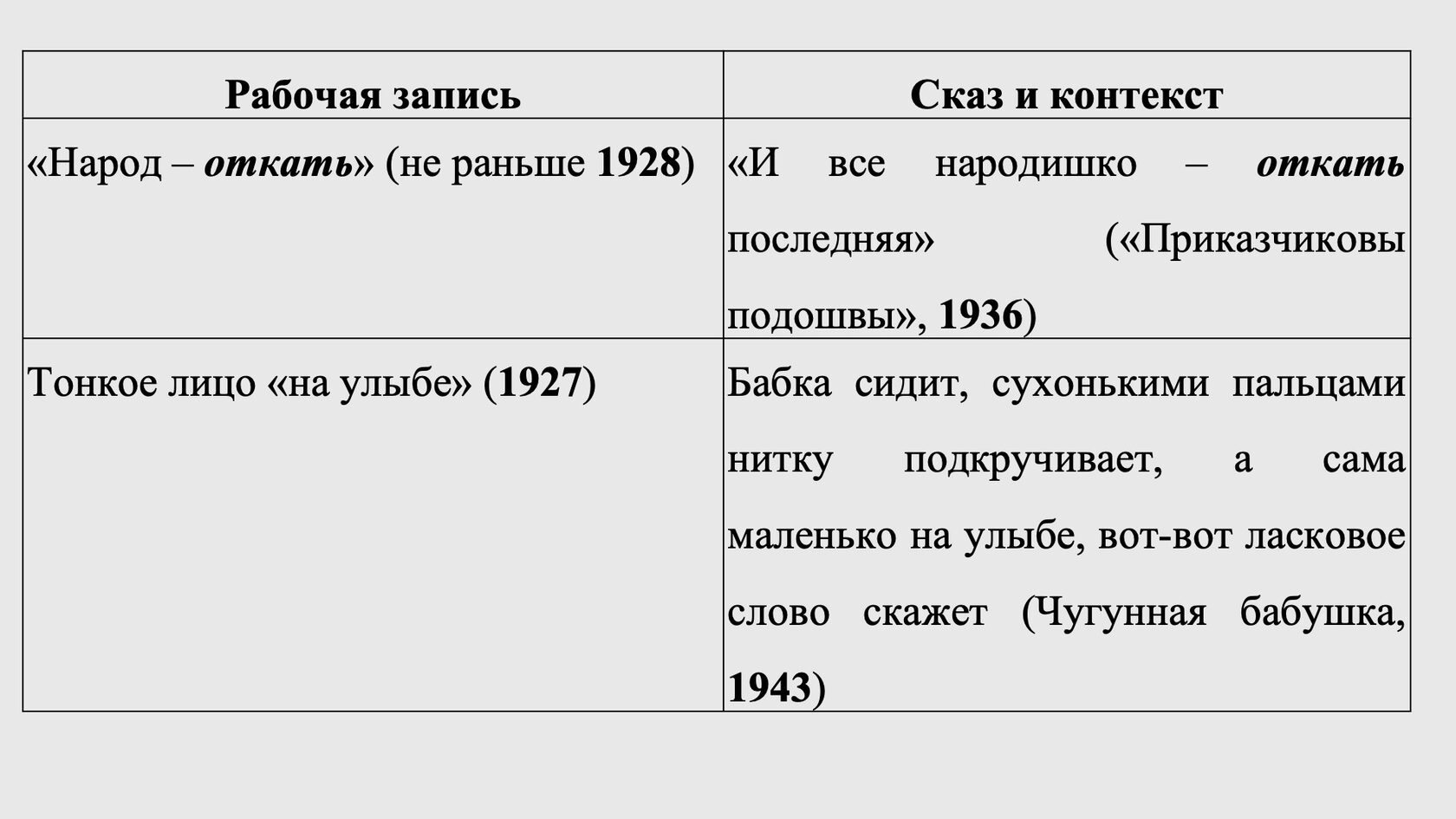 Материал написан на основе статьи Евгении Потаповой «“НАДО ПРИСЛУШАТЬСЯ И КОЙ-КАКИЕ СЛОВА ИГРОВЫЕ ЗАПИСАТЬ”: О жанровом составе неопубликованных “рабочих” записей П. П. Бажова» и выступления Евгении на Science Slam Екатеринбург