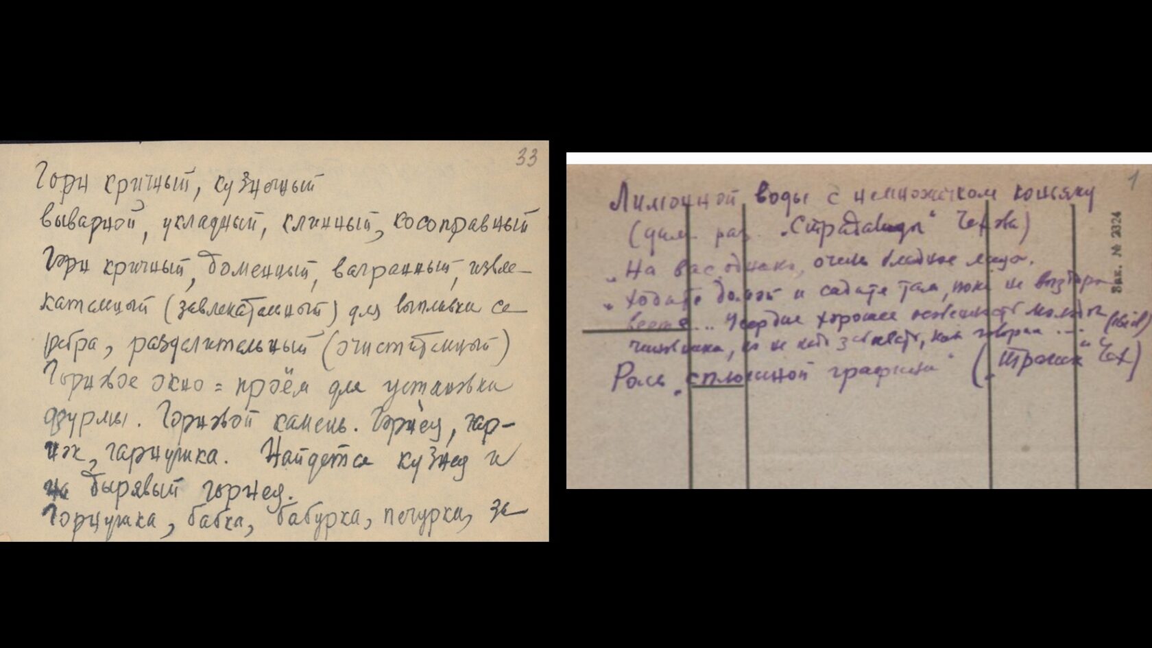 Собирая повторяющиеся вещи в таблицу, она с интересом заметила, что записные книжки, в целом, вполне можно сопоставить с доцифровой базой данных. Помимо научной работы, из этого анализа родился целый проект «Бажовский словарь»
