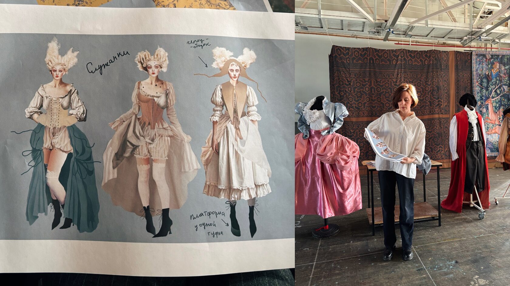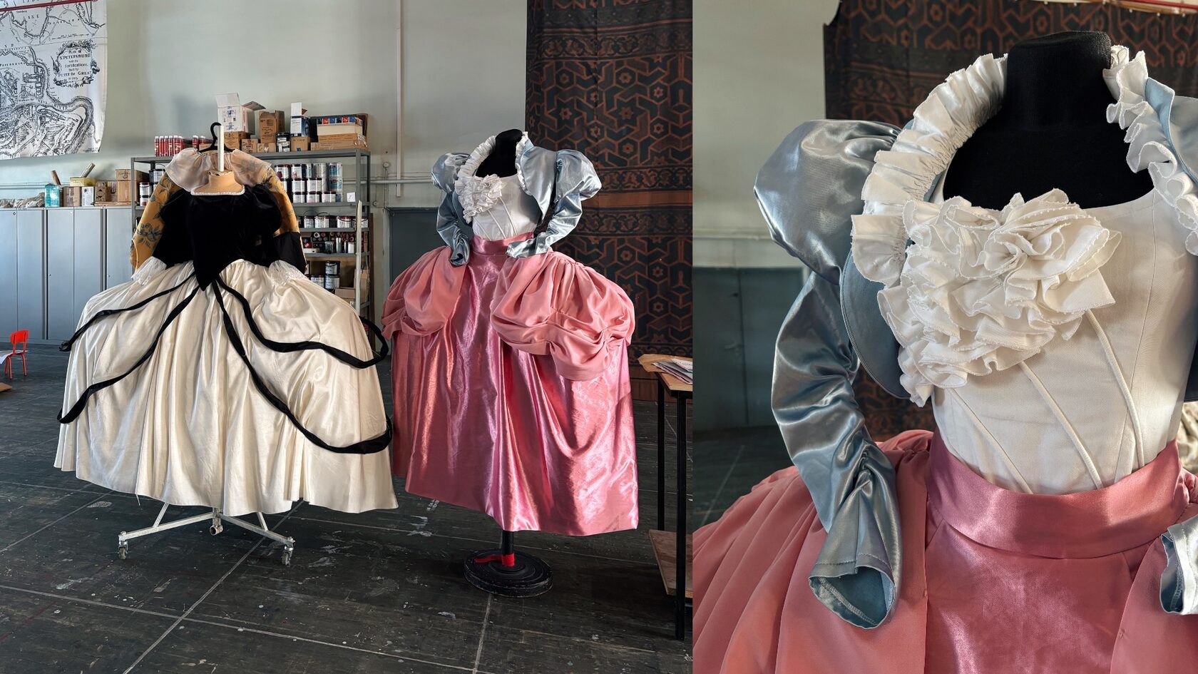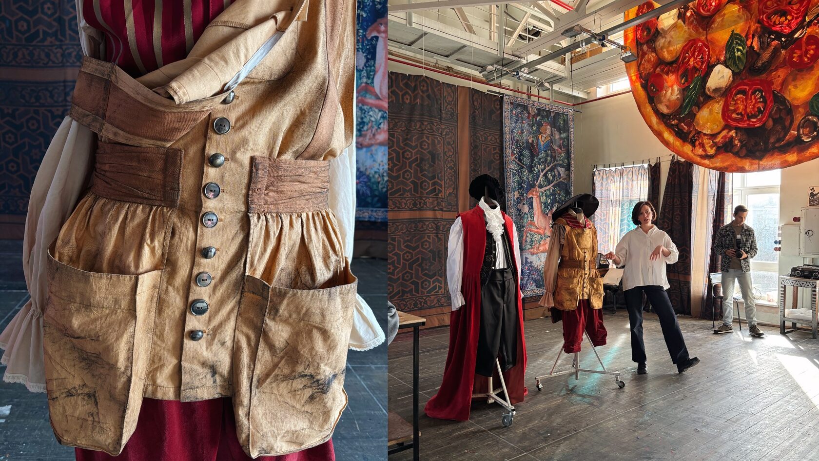 После осмотра декораций мы поднимаемся знакомиться с костюмами на самый верх, по лестницам и узким переходам — в цеха. Здесь рождается весь визуальный мир театра: шьются костюмы, красятся ткани, собираются детали декораций. Каждый персонаж «Цирюльника» — гротескный, нарочито прямой. Характеры персонажей отражаются и в костюме — например, жилет Фигаро сшит из той же ткани, что и обивка кресла (сумел себе «урвать»), огромный бант на платье Розины — символ подарка. Для многочисленных посланий и любовных записок предусмотрены специальные карманы. Огромное значение придается и героям второго плана — они не особо прописаны в пьесе и сочинять их образ приходится заново.
