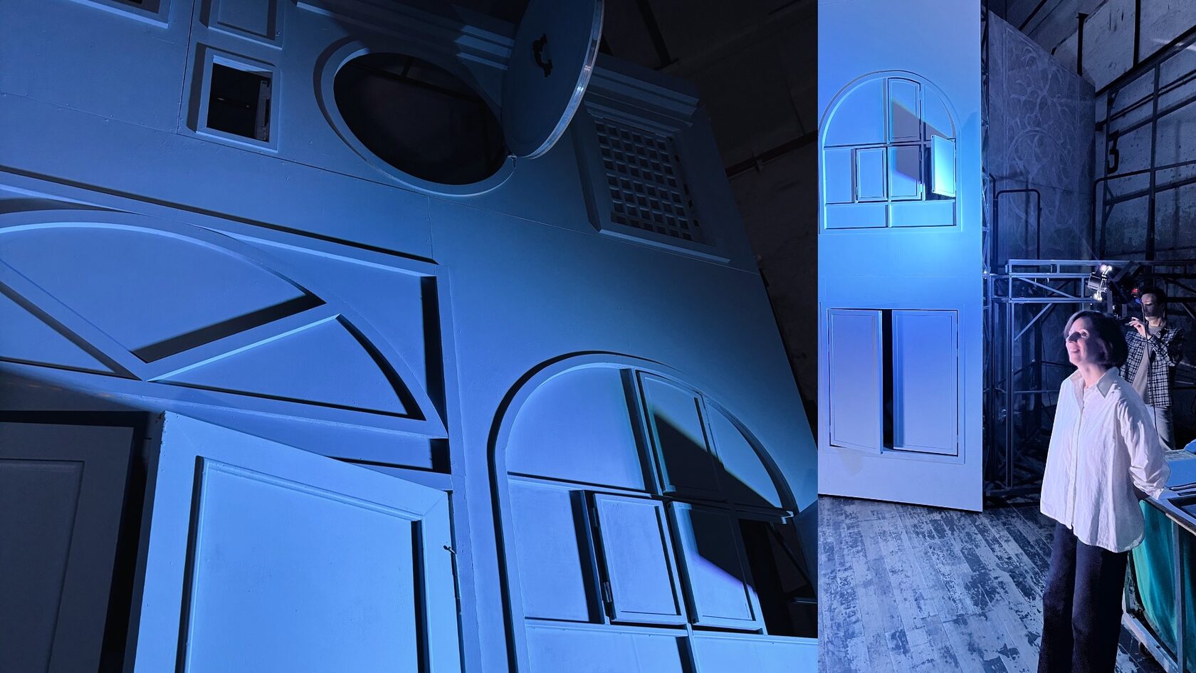Декорации классического «Цирюльника» — это всегда дом. Он живёт по своим законам: стены двигаются, ставни открываются. Дом играет роль — «подглядывает и подслушивает». За фасадом находятся сложные инженерные конструкции. Всё продумано, чтобы актёры могли перемещаться молниеносно и появляться в неожиданных местах. Кто-то из экскурсионной группы пошутил: а не застрянут ли артисты в узких проемах? Нет, это тоже отрабатывается на репетициях — конфузов быть не должно. Фасад дома серо-голубой — это нейтральный фон для ярких костюмов.